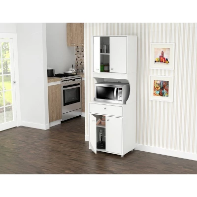 GALLEY Series Kitchen Storage Cabinet by Inval finished in a rich “White” laminate with durable melamine which is stain, heat and scratch resistant. It is constructed from manufactured wood and features a functional modern design that is an excellent choice for your home or office break room. It includes two (2) top doors and two (2) bottom doors featuring concealed European style hinges and embellished with brushed metal knobs. Each set of doors conceals one (1) adjustable shelf. Also included is one (1) large drawer with metal drawer glides for storing accessory items such as utensils. This unit has a convenient cable pass-through which is ideal for your appliances. Anti-tip hardware is included.