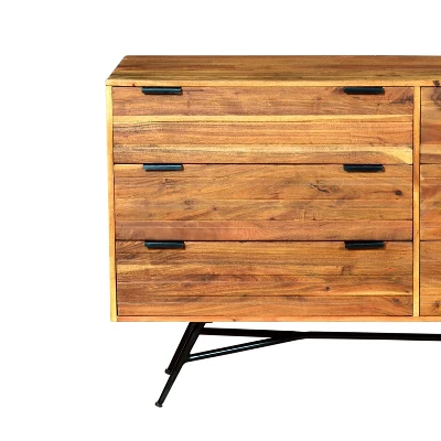 Give a quick makeover to your interior by bringing in this industrial style inspired Sideboard. Incorporated with 6 smooth gliding drawers to keep your kitchen essentials organized, the aesthetically pleasing grain details impart a riveting flair to it. Constructed sturdily from acacia wood frame for lasting durability, it is supported on angled metal legs with a reinforced trestle style base. The charming concoction of brown finish and striking black legs grant it an irresistible look and never fails to astonish an onlooker. The spacious storage allows you to keep your interior clutter free, while the wide top gives you plenty of room to flaunt vases, showpieces, valuable collectibles, and prized possessions.