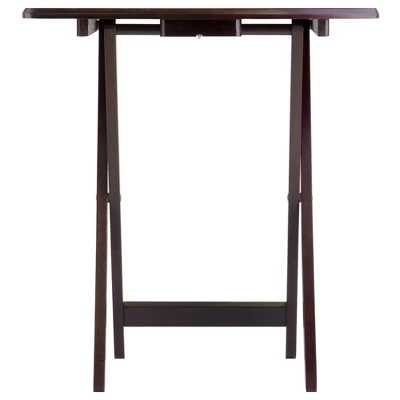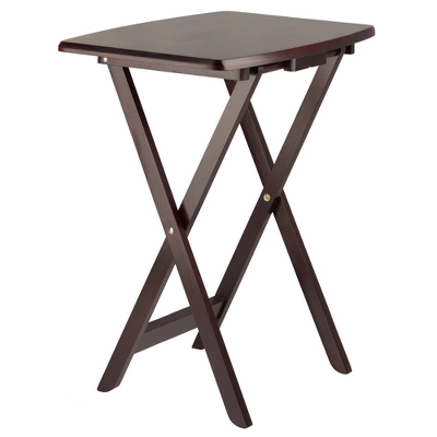 The Dylan 5pc Oversize Snack Table Set makes entertaining easy. Constructed of Solid Wood, this stylish set includes four foldable tables with X-frame bases and a convenient storage stand. The snack tables have gently curved sides and rounded corners and are oversized for more table space. Ideal for setting out appetizers at the big game or for grabbing a meal while you’re relaxing on the sofa. Finished in a rich Espresso.