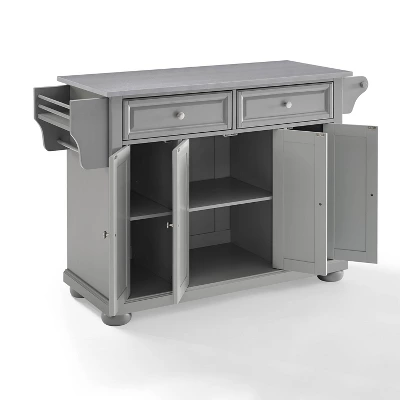 The Alexandria Full-Size Kitchen Island adds enduring style and storage to your kitchen. Featuring three cabinets, each with an adjustable shelf, this island can easily store pots, pans, and small appliances. Two large drawers keep small items like utensils and dishtowels close at hand, while the built-in spice rack and paper towel holder keep your counter space free of clutter. With a beautiful stainless steel countertop and classic bun feet, the Alexandria Full-Size Kitchen Island is a welcome addition to your kitchen space.