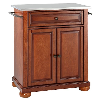 Create the culinary space of your dreams with an Alexandria, Stainless Steel Top, Portable Kitchen Island from Crosley. Constructed of solid hardwood with wood veneers, this kitchen island is designed for longevity. The hardwearing stainless steel top expands your serving and countertop space while the built-in cabinet and drawer offer extra storage. Raised panel detailing provides the ultimate in style to dress up any space. Style, function, and quality make this island a versatile, must-have addition to your kitchen space.
