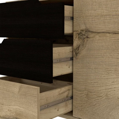 A sideboard cabinet that showcases mid-century modern lines for an elegantly minimalist feel that won’t break the bank. This piece wears a calming light natural wood finish with matte coffee accents, the charming cut-away handles pull together this pretty piece. This cabinet also has more than enough storage between three drawers and two large cupboard compartments.Â
