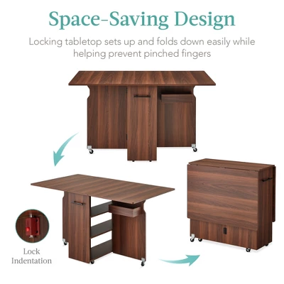 Let it all unfold with this versatile folding table! An ideal choice for dining, arts & crafts, and more, this table adapts seamlessly in a variety of settings. A side cubby helps you easily keep things like silverware and condiments stored, while three adjustable shelves make the perfect home for plates, bowls, jars, and more. Designed with built-in wheels, it moves from one place to another with little effort, and a convenient side handle eliminates the hassle from carrying it as well. After use, fold it down and store it in a compact space until the next time!