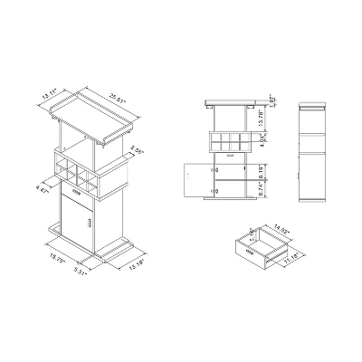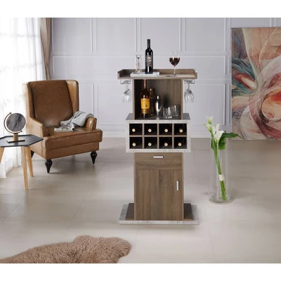 Keep your favorite wines readily accessible with this 8 bottle Bluford mini bar from miBasics. Accompany the wines with up to a dozen pieces of stemware on the sturdy hanging slats, and store wine accessories such as corkscrews and a wine stopper in the convenient drawer. Top the cabinet with a vase, lamp or other accessories to match your decor, or leave the space empty for a tray of appetizers at your next gathering for friends and family.