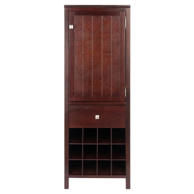 Bring a French Country look and modern convenience to any storage needs with the Winsome Wood Brooke Jelly Cupboard. This 3-sectioned cupboard blends the warmth of Farmhouse styling with clean, simple lines to provide lovely and valuable storage. The upper cabinet door closes with a soft magnetic catch and opens up to a removable shelf. The wainscoting panels on the cabinet door and the brushed silver cabinet and drawer pulls add an undeniable country charm that will change the look of the kitchen, dining area, or anywhere you need extra storage space. This cupboard is ideal as a wine cabinet with a 12-bottle wine grid, while the drawer allows ample space for bar accessories. Or remove the grid panels and bring additional storage according to your needs. Perfect in a country kitchen, dining room, or living room to create a variety of storage options. Constructed of solid and composite wood in a rich walnut finish. Combine this piece with other cupboards from the Winsome Brooke collection to create a modular set (each sold separately). Conveniently packed and shipped in 1 box, that includes the hardware necessary for assembling. Replacement part request can be submitted directly to the manufacturer within 60 days from date of purchase.