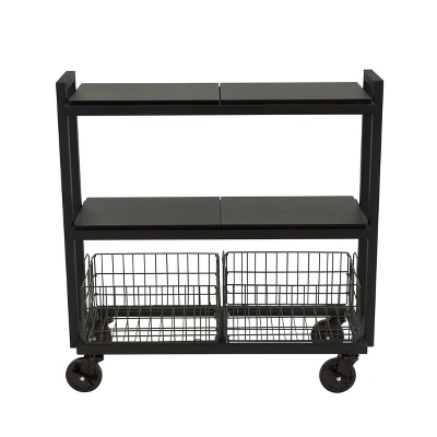 The Transformable 3-Tier Cart System provides efficient mobile storage for use in the kitchen, office or garage. Whether you are entertaining or just need extra storage, you can interchange shelves and baskets to suit your needs. The high quality, powder-coated steel frame is built for years of use. Four casters (two locking) allow for effortless movement. Contains 4 interchangeable premium laminated shelves and 2 sturdy wire baskets with liners. Each shelf allows for 12″ height and a weight capacity of 33 pounds per shelf.