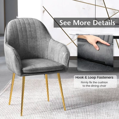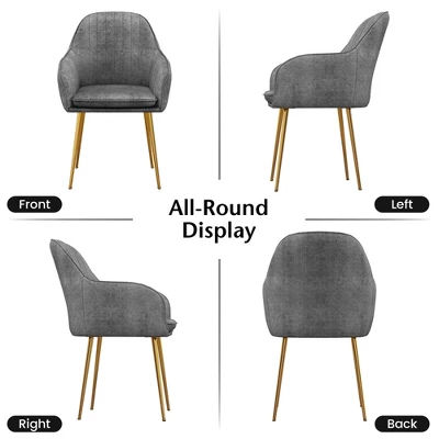 Designed with upholstered seat and golden metal legs with sleek electroplated finish, this dining chairs set offers comfortable seating and stable support while adding modern style. The simple structure is very strong and easy to put together. Each leg is attached with an adjustable feet to protect the floor from scratching. This ergonomic lounge chair with delicately curved back and angled armrests provides extra comfort to relax your body. They can also be used as dining room chairs, bedroom vanity chairs, home office chairs, etc.