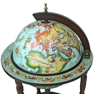 Raise a toast to honored guests from a 14″dia. Italian-style globe bar ensconced in authentic parchment-printed, 16th century replica nautical maps from the National Museum of Science in Florence. Bursting with Old World charm, our functional work of art opens from a hinged meridian to reveal artistic interior frescoes reminiscent of domed ceiling contraspecto (“view from the heavens”). Our Toscano exclusive boasts secure spots to show off your treasured decanter bottles and collectible liquor and barware. A trio of handsome, turned hardwood legs rises from rolling casters and a circular lower shelf, allowing additional storage and a moveable liquid feast! Simple assembly required. 18.12;”dia.x36″H. 16 lbs.