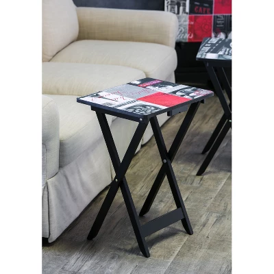 This unique set of tables will make a great addition and extra table space for your living room, den or man cave. Made of sturdy MDF wood, these tables are uniquely designed pieces with heat and water-resistant tops and heat-printed designs. This set includes 4 foldable TV tray tables and a storage stand that require some easy assembly upon arrival. Each table measures approximately 19.5 x 32 x 14 inches.