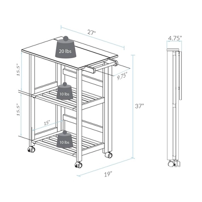 The unique feature of this wooden serving cart is that it requires no tools to set up and it takes less than a minute. The Trek Folding Kitchen cart is the perfect addition to any kitchen that could use some extra counter space. Its details are manifested in the beauty of solid wood with a natural finish. A space saver that stores easily in a kitchen with tight space. Featuring a 27″W food prep safe top, two shelves, and a towel bar to keep your kitchen cooking essentials close at hand when you need them. Lockable casters provide extra stability and mobility for multiple occasions. Product dimensions: 27″W x 19″D x 37″H.