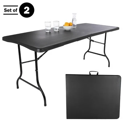 Make room for different activities in your space with this 6ft Folding Table Set of 2 by Everyday Home. Each foldable table has a powder-coated steel frame with a blow mold high-density polyethylene surface with stain and scratch-resistant properties for an easy cleanup. This outdoor folding table set comes with 2 tables that comfortably seat 8 people each, so you can hold large dinner parties and card or board game nights, or use them as camping tables, makeshift desks, or tailgate tabletops.