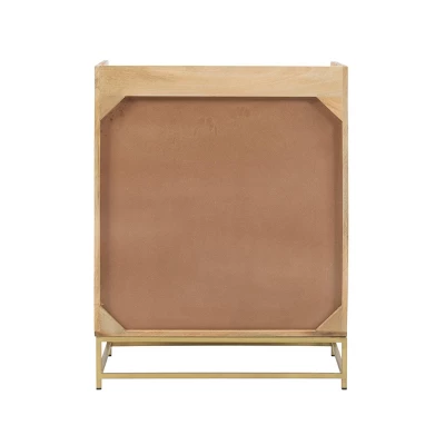 With an unbelievable list of features and a classic midcentury aesthetic, this cabinet is truly the quintessential home bar centerpiece. 2 cane panel doors open to reveal 4 shelves over 13” wide, 6 hanging racks for numerous wine glasses, 3 cubbies for storing bottles and a wooden drawer for corkscrews and utensils. A white marble top with black swirls is surrounded by a wooden border on 3 sides, creating a dream working station for casual and expert bartenders alike. The frame is constructed of solid mango wood in a natural finish and supported by an iron base in gold that holds the structure 6” from the ground. Beautiful craftsmanship and decked out storage; now all you need is the party.