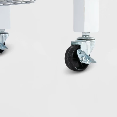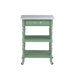 Entertain guests with ease with the Hennington Kitchen Cart With Stainless Steel Top. This portable cart has four locking caster wheels, so you can easily roll it from the kitchen to the dining room or living room as needed. Store napkins, dishware, cutlery, bar tools, or desserts within handy reach when you have company over. After guests leave, pile the dirty dishes on the cart and wheel it back to the kitchen for cleaning. A slender drawer, two shelves, a metal rod, and a wire basket provide room for storing pretty much whatever you need. The stainless steel top even makes a handy prep station if your kitchen is short on counter space.