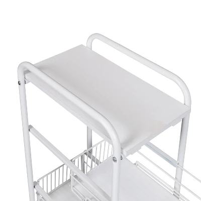 Slightly larger than a foot wide, this sleek and narrow rolling cart is on a roll when it comes to organizing small homes. It easily slips into corners or unused space between furniture with its tiny footprint—adding 3 drawers and 1 shelf of versatile storage. When used as a kitchen cart, the drawers can organize everything from tin foil to tall containers. And in other parts of the home, this rolling organizer cart with drawers is equally as useful. Roll it into the craft room to organize art supplies, into the home office to clear clutter, or into the bathroom to sort beauty products. No matter where you use it, the open design of this slim storage cart allows you to see where you are placing items and what you have on hand, saving you time and frustration.