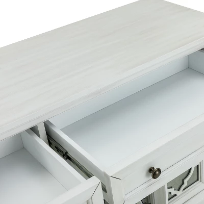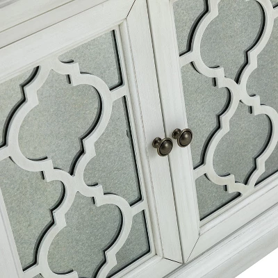 Add extra storage to your space with this clean, gorgeous sideboard that complements traditional and contemporary decorating styles. It is made of manufactured wood and is available in two different color finishes. Featuring two drawers and four doors, this piece also features interior storage shelves, while the striking glass front and pattern design keep your favorite items at a glance. Enhance your living standards and the beauty of your space with this practical and beautiful sideboard. Item Size: 58″Wx18″Dx34″H