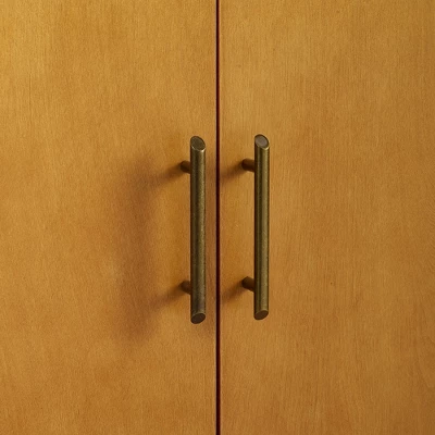 Make the Landon bar cabinet your signature mid-century piece. With short tapered legs and a square shape, this bar cabinet has a sleek design that lends itself to being an easy addition to most rooms of your home. The warm acorn finish is highlighted by the antique brass handles on the doors. Open these doors to reveal plenty of storage space for wine and cocktail glasses. There are also designated spaces for bottles within the cabinet, as well as, on the inside of the doors. Use the ample counter space as a mixing station, or a place to display nick knacks. The Landon bar cabinet is versatile and ready to party.