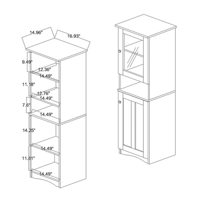 - Oveall Dimensions: 62.40″ High x 16.93″ Wide x 14.96″ Deep; Top shelf behind glass door: 9.49″ High x 14.49″ Wide x 12.36″ Deep; Bottom shelf behind glass door: 11.18″ High x 14.49″ Wdie x 12.76″ Deep; Open shelf: 7.60″ High x 14.49″ Wide x 12.76″ Deep; Top shelf behind lower door: 14.25″ High x 14.49″ Wide x 12.76″ Deep; Bottom shelf behind lower door: 11.81″ Highx 14.49″ Wide x 12.76″ Deep;