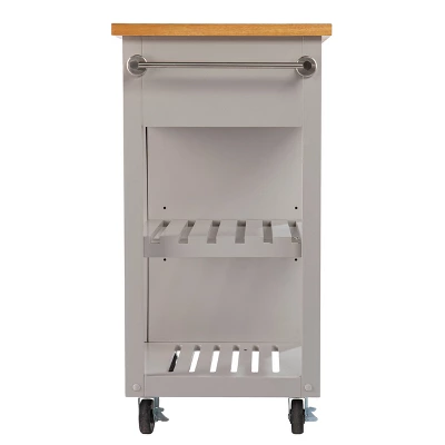 Bring convenience to your living space with the Aiden Lane Lostry Kitchen Island with Storage. A spacious drawer tucks away utensils and measuring cups, while a cabinet and two open shelves organize cups and dishes. Place this small space island in your kitchen to prepare lunches and baked goods or roll into your living area to serve guests at your next dinner party. Customize your kitchen storage when you add this island on wheels to your home décor.