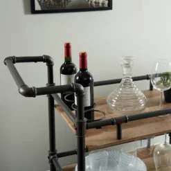 Give your home a charming modern industrial touch with this birdhouse inspired wine cabinet. A roof-shaped metal rack hangs glasses while a U-shaped cut-out offers a place to serve. The double-door cabinet houses a 5-slot bottle holder to keep wine protected. With plenty of convenience shelving and a drawer for wine essentials.