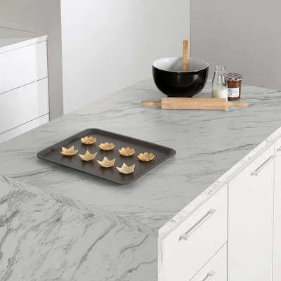 Brighten up your kitchen decor with this trendy, sophisticated Contemporary counter. Its slim metal handles and sturdy surface will add a clean, distinguished touch to your room. Another plus: the surface and sides of this piece are made of melamine, so they’re water and scratch resistant.