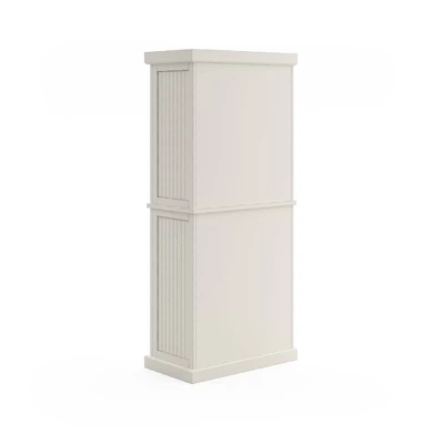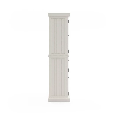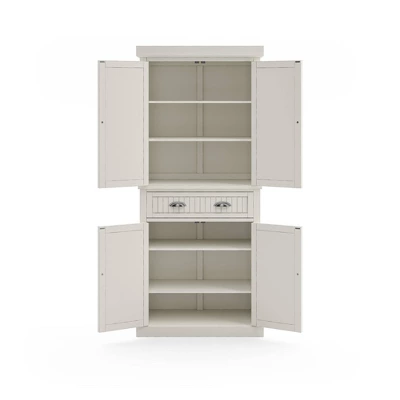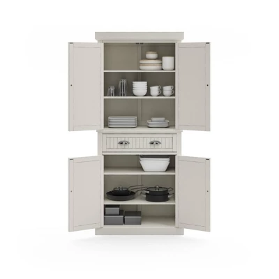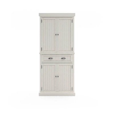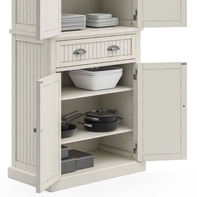 Open the double doors and feel the sea breeze with this Homestyles Nantucket Pantry. With upper and lower compartments separated by a single wide drawer, it gives you all the extra storage a kitchen needs. The sanded Off-White finish gives it that weathered feel that makes it look like it was pulled from an oceanfront villa.
