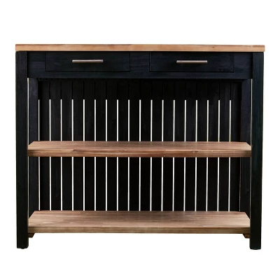 Meal prep like a pro with the Aiden Lane Nashhex Expandable Freestanding Kitchen Island. A spacious countertop offers plenty of room to chop veggies and mix up a batch of cookie dough, while the drop-leaf panel adds extra space to pull up a chair. Open storage shelves keep dishes, pots, and pans organized, while two convenient drawers tuck away utensils and measuring cups. Create a stylish eat-in kitchen when you bring home this two-tone island with storage.