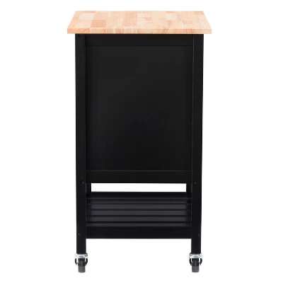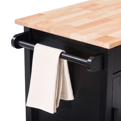 Compact kitchen? No problem! Add extra space to work, serve, and stow away kitchen accessories with this must-have kitchen cart. Its frame is clean-lined and showcases a classic finish to fit in any home’s aesthetic. The top has a neutral wood grain finish and the pinewood legs are supported by four wheels with locking castors so your cart stays in the location of your choosing or can be moved at any time. With open and closed storage from the drawer to the cabinet, towel rack, and shelf you have ample space to keep all your kitchen necessities within arms reach.