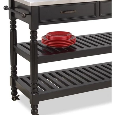 Turn your kitchen into the most magnetic room of the house with this Homestyles General Line Kitchen Cart. Easily roll the prep space wherever it’s needed, and bring extra storage and convenience with it. The black finish matches any surrounding décor and the drawers and shelves keeps the space tidy. With solid construction, a timeless stainless steel top, and a durable clear coat, it is easy to clean and maintain.