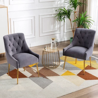 There are many beautiful design details on this dining chair (set of 2), The classic tufted design adds luxurious comfort to your dining experience. Whether your intention is to place it in your guest room for a splash of color and comfortable rest for weary visitors or to place it around the dining room table, this is a chair that exudes comfort and elegance. The slender polished golden metal legs bring modern design and add to the timeless fashion of this piece. Place 2-together to create a conversation area or pair with arm loveseat or sofa for a cohesive look.