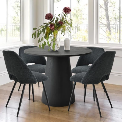 Serve up modern style with this set of 4 dining chairs from The Pop Maison. Each chair features an engineered wood frame with foam seat padding and luxurious faux shearling upholstery. The seatback is elegantly curved, and the black steel legs are flared, offering sturdy support for up to 250 lbs.These side chairs also come with plastic glides on their feet to protect your floors from scratches and scuffs. Whether you’re going for a contemporary or mid-century modern look, this stylish set is the perfect addition to any dining space.The faux shearling upholstery adds a cozy and inviting touch, while the sleek design of the chairs allows them to fit seamlessly into any decor style. Perfect for entertaining guests or enjoying family meals, this set of dining chairs is sure to elevate the style and comfort of your dining space.With a set of 4 chairs, this collection is perfect for larger dining spaces or as additional seating in any home. The chairs’ engineered wood frame and foam seat padding provide both durability and comfort for extended use.