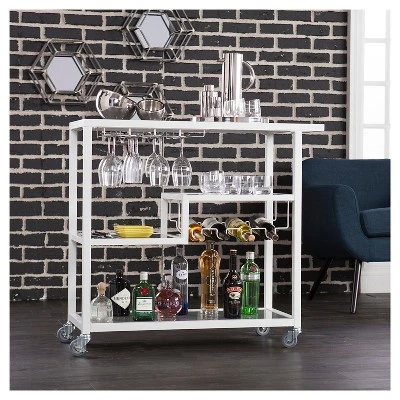 Well served. Keep the party rolling with the Holly & Martin Zephs Bar Cart. Stemware racks and bottle holders keep your breakables in place, shelves handle mixers and assorted accouterment. Casters keep you on the move or locked in position. Roll with the flow with this party wagon, or mix things up; repurpose the Zephs as a coffee and kitchen accessory center.