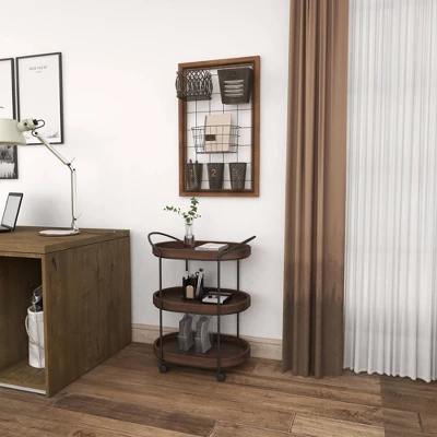- •This 3-tier mini bar cart is constructed using welded metal carrying oval wood inlays and four wheels