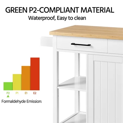 - STURDY CONSTRUCTION: This quality-built kitchen island is crafted from CARB P2-compliant engineered wood base and varnished bamboo countertop