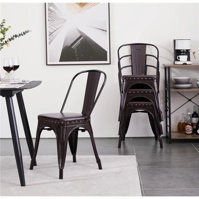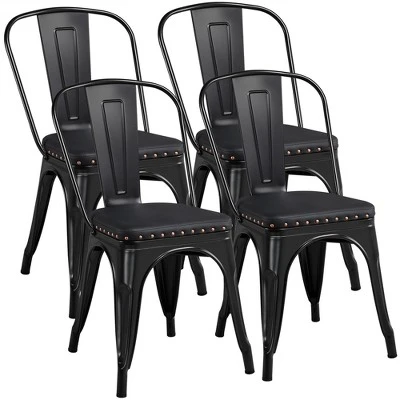 They are metal with soft cushions covered by durable leather. The quality materials and strong structure make sure the dining chairs will work well for years. With full black/brown color and rivet-sided decoration, this set of stylish chairs will bring a much unique charm to your house. Sold in 4 pieces with good value. The overall size: 17.5” W x 21” D x 33” H. The height and width of the back is 14.6” and 17.5”. The seat height is 18.5. And dimension of the seat is: 14.6” W x 14.4” D. Max. weight capacity: 330.7lb. Please see image for exact measurements.